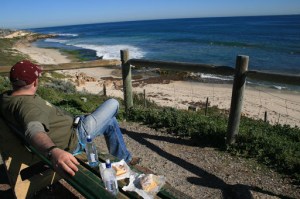 donde aprovechamos para comer el pastel, y pelear un poco con las gaviotas que son extremadamente chapas, las casas o mansiones de todo este recorrido son impresionantes con grandes cristaleras mirando al Océano Indico, aquí si son de dos alturas pero todas distintas, de lo mas moderno al estilo mas Mediterráneo, y la verdad, no haría ascos a ninguna. Los cafés y restaurantes son bastante pequeños y con terrazas muy solicitadas, hay también alguna tienda de surf, alguna de licores y poco mas.