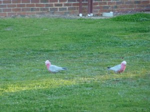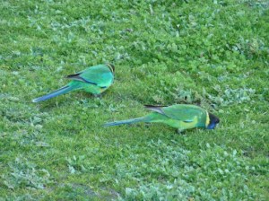 Desde la habitación se oían los gritos de un montón de pájaros, y comprobamos que en su mayoría eran loros verdes de un tamaño mediano, que volaban como rayos en cuanto te acercabas mas de la cuenta, también había una especie de cacatúas grises y rojas con un curioso penacho en la cabeza que estaban por parejas.