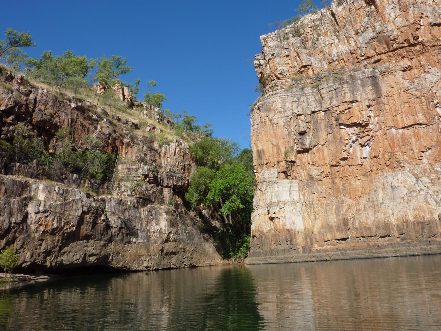 La visita al parque Nitmiluk, concretamente a Katherine Gorge, se puede realizar de tres maneras, la primera es caminando, lleva unos cuantos días y tiene zonas realmente complicadas de acceder evitando el meterte al agua, la segunda es en canoas, divertida y en un día puedes llegar a ver tres gargantas, la mayor dificultad es que entre unas y otras hay que llevar la canoa a hombros, mi segundo problema es que probablemente me ahogaría. La tercera es en un tour en barco, que durante aproximadamente cuatro horas, te pasea por el rió, cambiando de barco en barco, para cada una de las Gorges.