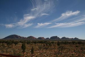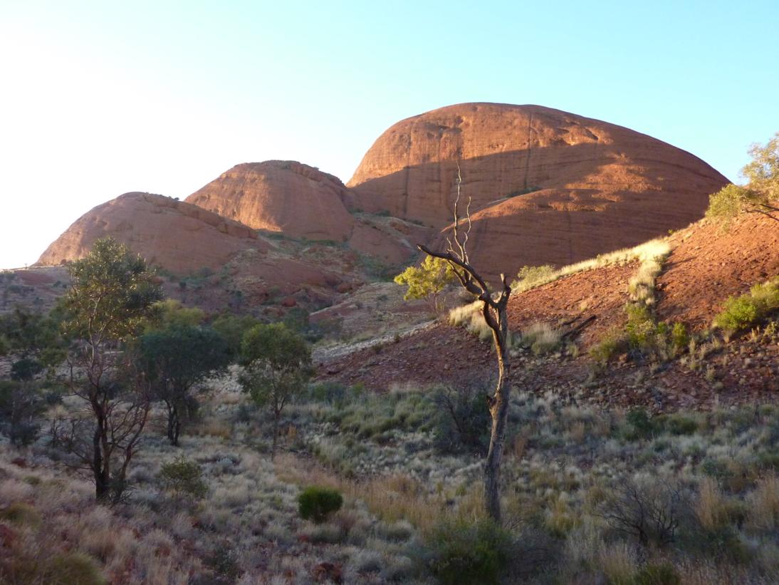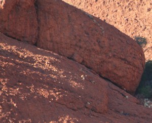 Una vez abajo la vista de la cara oculta de Kata Tjuta es absolutamente diferente a la que ves desde el primer mirador pero igual de impresionante. Mirándolas fríamente las Olgas son aun mas bonitas estéticamente que Uluru pero les falta la solemnidad de este, eso si lo compensan con las curiosas formas que tienen y la forma en que se enlazan como si jugaran entre ellas, las hubiesen descubierto y tuviesen que estar quietas hasta que las dejen de mirar, aunque siendo tan espectaculares tendrán que permanecer así mucho tiempo.