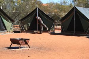 La primera sorpresa es la comida, sacan los alimentos y nos piden ayuda para prepararla, unos cargan cajas, otros lavan y trocean la ensalada, y los demás preparan la mesa. Después de comer a seguir con la ayuda, toca fregar, recoger y todos a Ayers Rock o Uluru según los nativos.