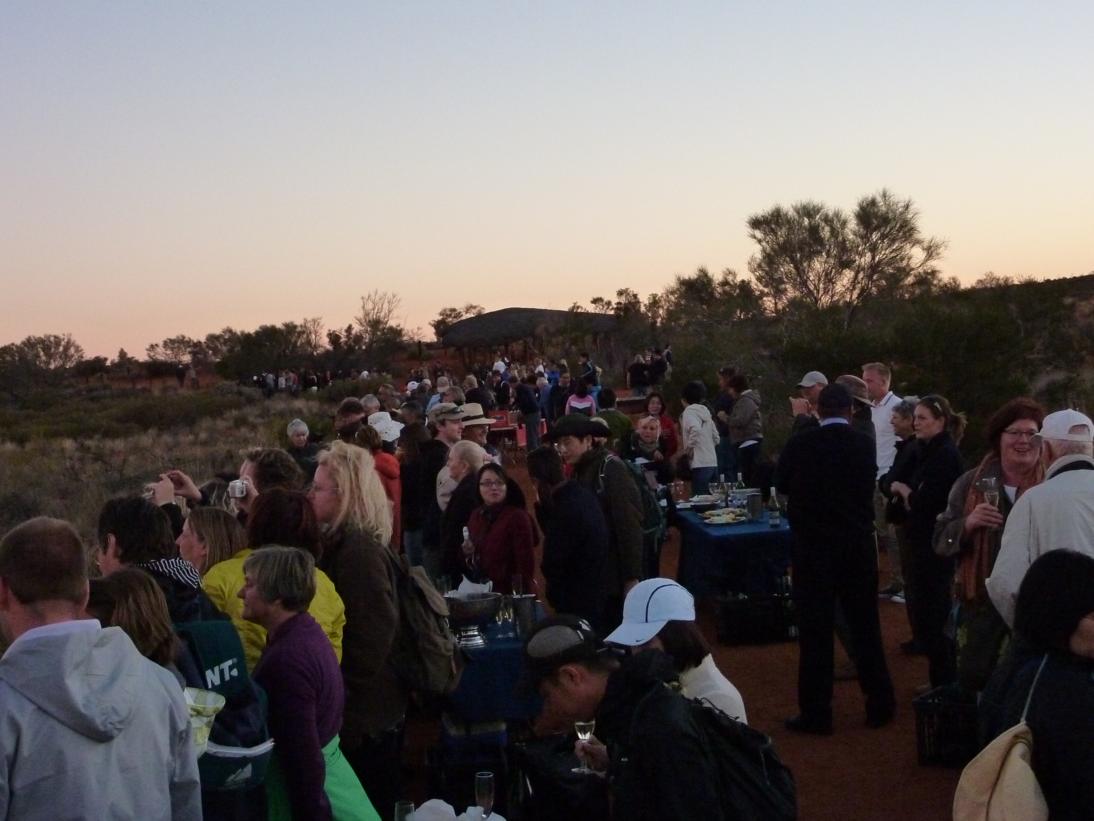 No todo podía ser color de rosas, en el tour incluían una visión de Uluru al atardecer con una copa de champanes para disfrutar de una vista exclusiva y un momento único. Champagne si, vale había champagne e incluso aperitivos, pero exclusiva, como que no, cientos de personas se amontonan en una única franja de tierra al borde de una cuerda con multitud de mesas iguales, para hacer lo mismo y a la vez.