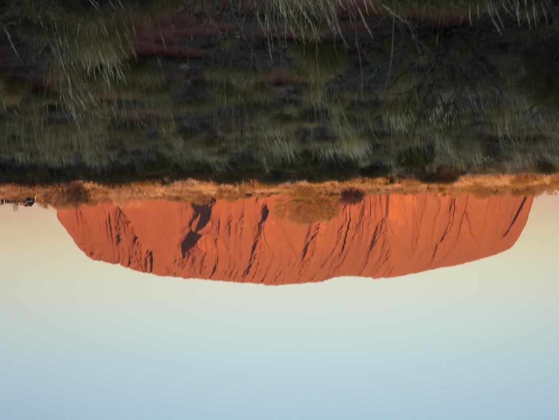 La primera imagen de Uluru se tiene desde el camino que lleva hacia el alojamiento, ves una inmensa roca roja que se levanta en mitad de una llanura casi absoluta, ves una cima plana y como en la mitad de los lados nace una especie de falda que viste el monte.