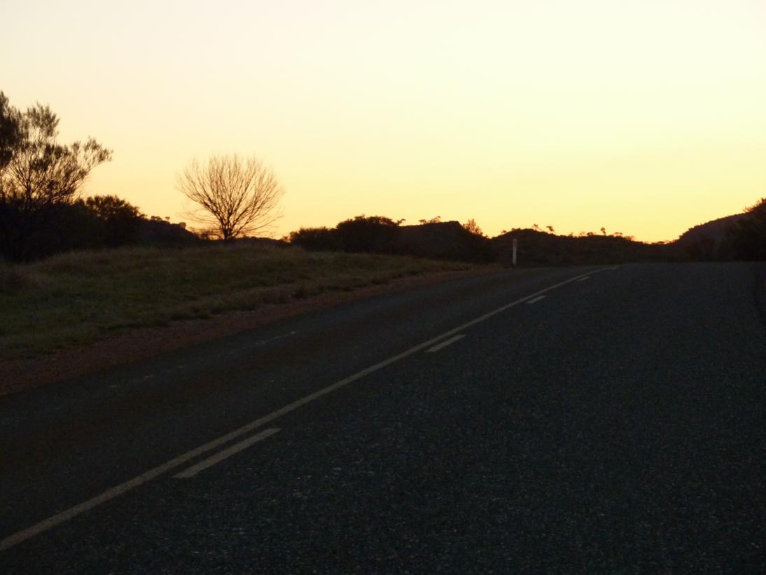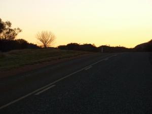 La vuelta desde aquí hasta Alice lleva mas o menos una hora y media, que se convierte en casi dos por las continuas paradas para sacar fotos, porque debido a la hora el paisaje va cambiando por minutos. Cada subida o bajada del nivel de la carretera cambia las sombras y da matices a lo que vemos. Ademas la fauna local se dedica a amenizar el camino, bandadas de cientos de loros verdes, lagartos rodeados de espinas e incluso un par de canguros saltando a toda velocidad y un Dingo perezoso salen a despedirse de nosotros.