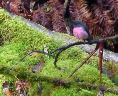 Entre chaparrones de lluvia empezamos a encontrarnos con mas amiguitos Pademelons, casi todos están en grupos de dos o tres y aunque no se acercan parecen simpáticos, son pequeños y redonditos con aspecto de suaves, algunos están muy gordotes, será porque no paran de comer. También vemos bastante pájaros, algunos tienen colores muy vistosos como el Pink Robin que juega sobre el río saltando de rama en rama.