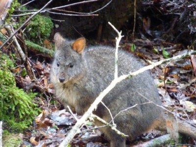 Justo antes de la catarata en un costado oímos un ruido, algo se mueve, pero en cuanto nos acercamos se calla, casi ni lo vemos porque se ha quedado quieto como una estatua, es un Tasmanian Pademelon, una mezcla de roedor y marsupial de unos 50 centímetros de alto que disimula para ver si hay suerte y no lo vemos.