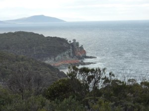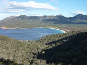 Freycinet National Park es también un parque principalmente compuesto de playas y bahías con algo de monte rodeándolas. Dentro del parque esta Wineglass Bay, considerada como la playa mas bonita de Tasmania y seguramente de Australia. El acceso es complicado ya que solo se puede llegar a pie o en barco, el camino a pie es a través de una montaña, y aunque no es largo es bastante duro por su inclinación. Se tarda aproximadamente una hora en subir hasta el mirador, y otra media hora en bajar hasta la propia playa. Desde el mirador se entiende porque la gente queda cautivada por esta playa. La arena blanca crea medio circulo perfecto alrededor del agua azul, dando la forma de copa de vino con la que bautizaron la bahía. Es bonita, pero para mi ni de lejos al nivel de las que hemos visto en el norte.