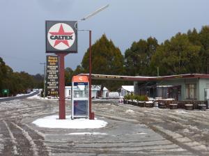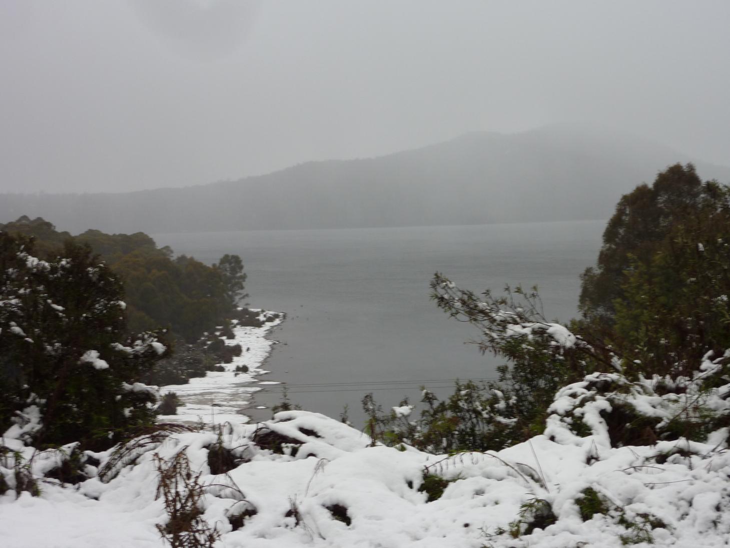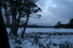La Lyell Highway cruza Tasmania de Este a Oeste, es una carretera bastante principal que la mayoría del tiempo no lo parece, aunque no tiene demasiado trafico es demasiado estrecha, cruza varios puertos y tiene miles de curvas muy cerradas y con cero visibilidad. Si a eso le añadimos que a lo largo de unos 50 kilometros de montaña esta nevada y con varios accesos cortados, se convierte en poco recomendable, a no ser, que tengas un, recuerda, enooooorme Patrol y estés loco, o al menos seas tan cabezón como para no cambiar de camino por esas pequeñas menudeces que son los puertos cerrados. Así que tras un montón de kilometros entre prados, colinas y algún que otro puente de un solo carril curioso, empieza nuestra subida hacia lo desconocido.