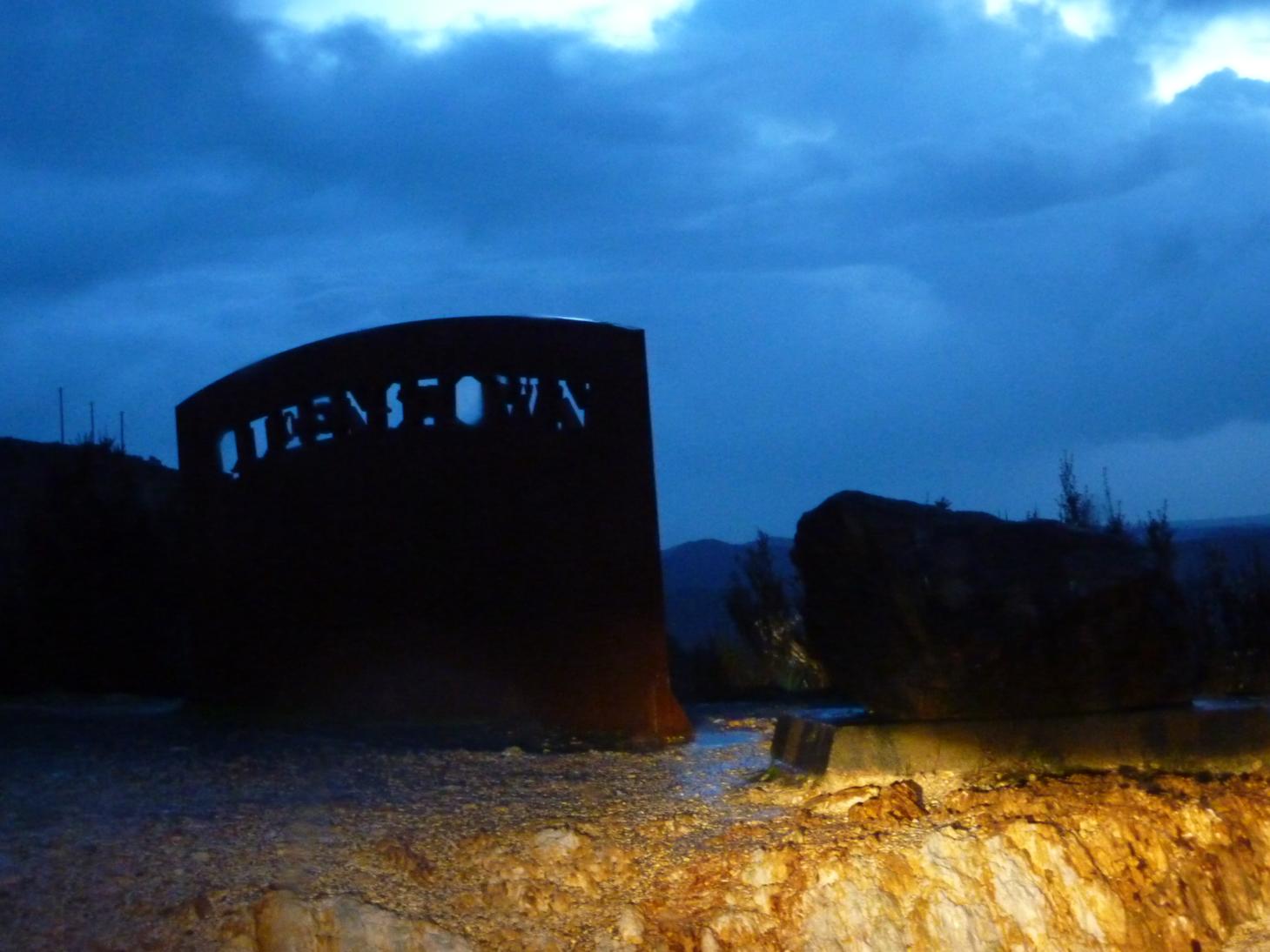 Doblamos una curva y en vez de ver Queenstown, vemos a lo lejos una catarata altísima entre las montañas, tan espectacular que paramos para intentar sacar una foto aprovechando la luz de la luna. Un poco después vemos las luces, justo antes de llegar a un punto de información con un letrero con el nombre de la ciudad desde el que se ve una furgoneta que se ha despeñado por el camino, es un aviso para navegantes ya que desde ahí hasta el pueblo hay muchas y peligrosas curvas a través de un paisaje con aspecto lunar, tan impresionante que al día siguiente volveremos a subir para poder fotografiarlas.