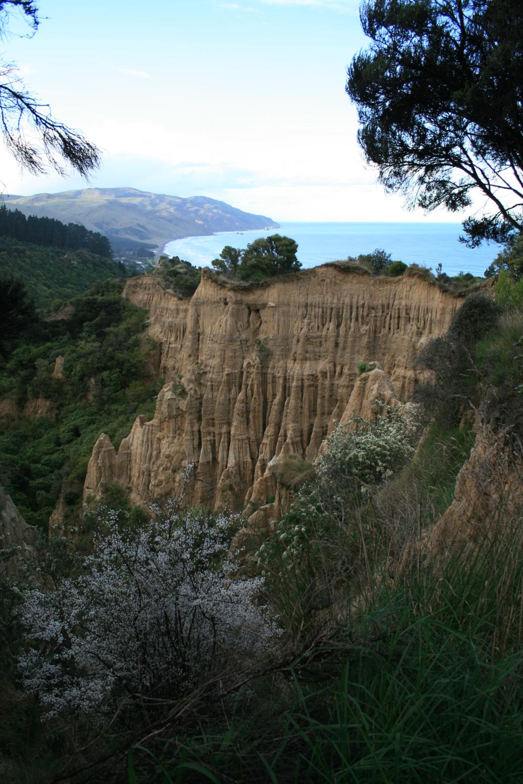 Cogemos un desvió y hacemos una parada en Gore Bay cerca de Cheviot, las vistas son impresionantes, en primer plano nos encontramos unas paredes de roca cortada y al fondo aparece una playa cubierta de piedras redondeadas de diferentes colores en las que la marea y las tormentas han dejado abandonadas cientos de maderas, ramas e incluso arboles enteros.