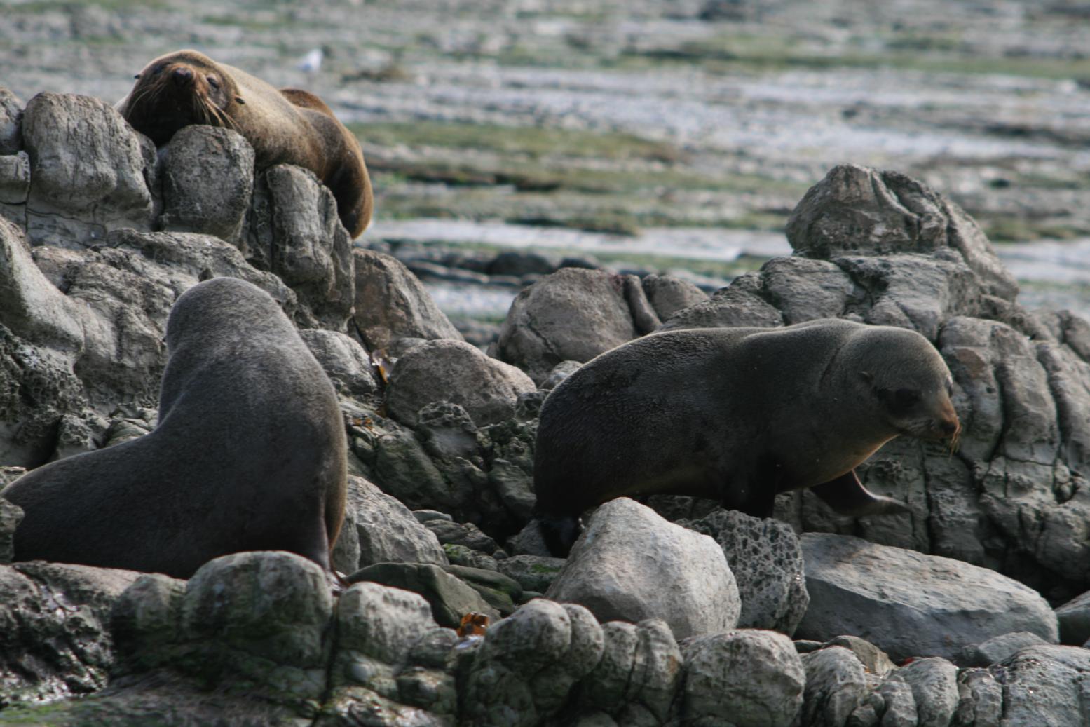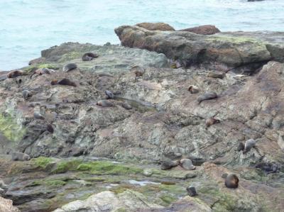 También en Kaikoura damos un paseo rodeando la costa que en algunos puntos esta formada por rocas fileteadas por la fuerza del mar y masas enormes de algas de todo tipo, algunas parecen de plastico por su dureza y otras son como collares de cuentas, pero de lo que se trata es de ver una colonia de focas, al principio solo vemos un par de crías jugando en una poza, así que continuamos andando hasta que se pone peligroso ya que en cualquier momento empezara a subir la marea y lo cubrirá todo de agua. Volviendo a por la caravana, vemos que justo al lado del parking pero en la dirección contraria a la que habíamos ido, están todas las focas de la colonia. Las encontramos tranquilamente tumbadas al sol, a escasos metros de los coches, sin hacer nada mas que dar vueltas sobre si mismas y rugir a algún fotógrafo aficionado que se acerca mas de la cuenta.