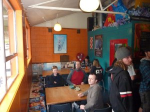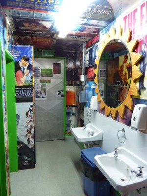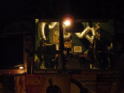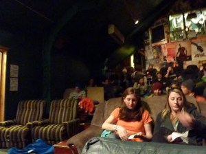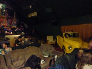Llega la hora y la gente entra, lo que me permite pegar un vistazo a la sala, es pequeña y bastante inclinada y los asientos….. hay de todo, un sofá de casa, una butaca orejera, los asientos de un coche, con el morro del coche incluido, unos cuantos asientos de avión de alguna aerolínea olvidada, todo muy peculiar. Otro ejemplo es la manera de calcular el aforo, una vez que la gente ha entrado tiran de la lista de reservas de emergencia en lo que yo por si acaso me apunto. El dueño asoma la cabeza, mira y dice: al fondo queda sitio para tres mas, algún grupo de tres en la lista ?, parece que uno mas en el butacón del medio, uno solo? Cruzo los dedos y me toca, me despido de mi sufrida mujercita que tendrá que pasar tres horas entre cafés y libros en esta tarde lluviosa y voy para adentro.