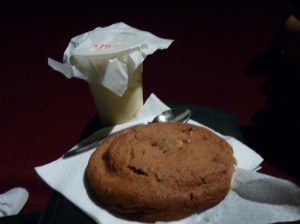 Lo original del cine continua cuando a media película. hacen un descanso para que la gente salga al bar y reponga provisiones, la especialidad de la casa son las galletas recién hechas y el helado, cojo uno de cada y para adentro de nuevo, hay quien se coge sándwiches, cervezas o incluso pizzas gigantes, todo un espectáculo. Cuando se ha liquidado la cola de la barra y del baño la película. vuelve a empezar, aunque como las galletas se han acabado, los camareros preparan una segunda hornada y se cuelan de vez en cuando por la sala para acercar galletas a los que se habían quedado sin ellas.