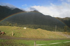En una de las rectas donde nos paramos para disfrutar de la vista nos damos cuenta de que a nuestra izquierda se esta formando un perfecto arco iris. Necesitábamos ese algo que apoyara nuestra esperanza de que el tiempo iba a cambiar. Cuando viajas asumes que no siempre vas a tener un tiempo perfecto pero la suma de frío, lluvia constante y el estar con la caravana que no te permite tener esos momentos de descanso que te da un hotel, estaba empezando a hacer mella en nuestra moral y sobre todo en nuestra salud.