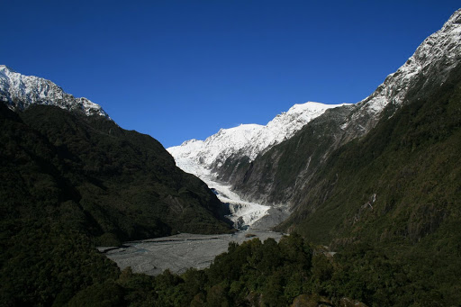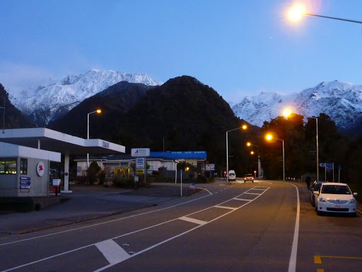 Y parece que aquel indicio fue cierto porque según subíamos hacia los glaciares el cielo era cada vez mas azul y la vista mas asombrosa. Cuando paramos a dormir en Franz Joseph Glacier estaba casi anocheciendo pero la luz daba un aire distinto a la vista, incluso cuando las luces de las farolas se habían encendido, la luz del atardecer permitía sacar unas ultimas fotos a las montañas nevadas recortadas contra el azulón del cielo.