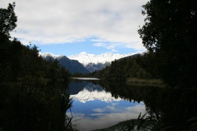 De ahí nos vamos a Fox Glacier pero en vez de dirigirnos directamente al glaciar nos alejamos un poco y nos acercamos al lago Matheson. Recorremos el camino que lo rodea y sacamos unas fotos espectaculares del glaciar, aunque hay algo de viento la imagen de las montañas reflejadas en el lago se aprecia perfectamente.