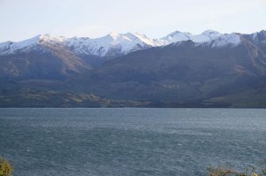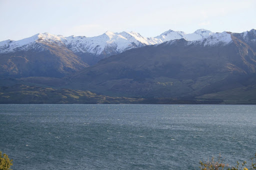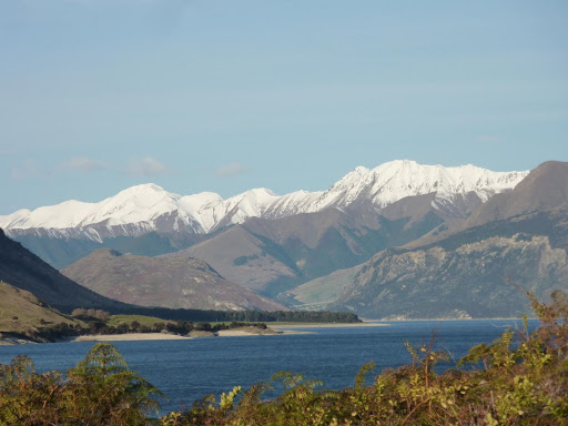 Finalmente aparece el primero de los inmensos lagos que componen Lakes Country, es Lake Haiwea y mientras vamos bordeando una de las orillas, en la otra vemos una nueva cordillera de montes nevados que caen prácticamente hasta el agua, así que las continuas áreas de picnic nos permiten parar unas mil veces para descansar contemplando la vista. Aunque el primero se mantiene mas tiempo a nuestro lado el segundo en aparecer Lake Wanaka es igual de espectacular y al acceder a el desde una posición elevada mejora la vista de sus aguas azul oscuro contrastando con el blanco de los montes que los rodean.