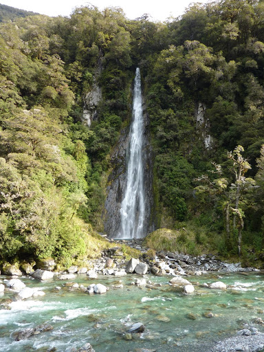 Cuando llegamos de nuevo a la costa, parece que esta de envidia con las montañas y nos deja un espectáculo precioso de olas frente a los islotes y acantilados próximos a Haast. A continuación nos espera un nuevo puerto en el que la carretera va en todo momento acompañada por un rio, que en algunos puntos forma unos rápidos considerables, también nos encontramos alguna catarata.