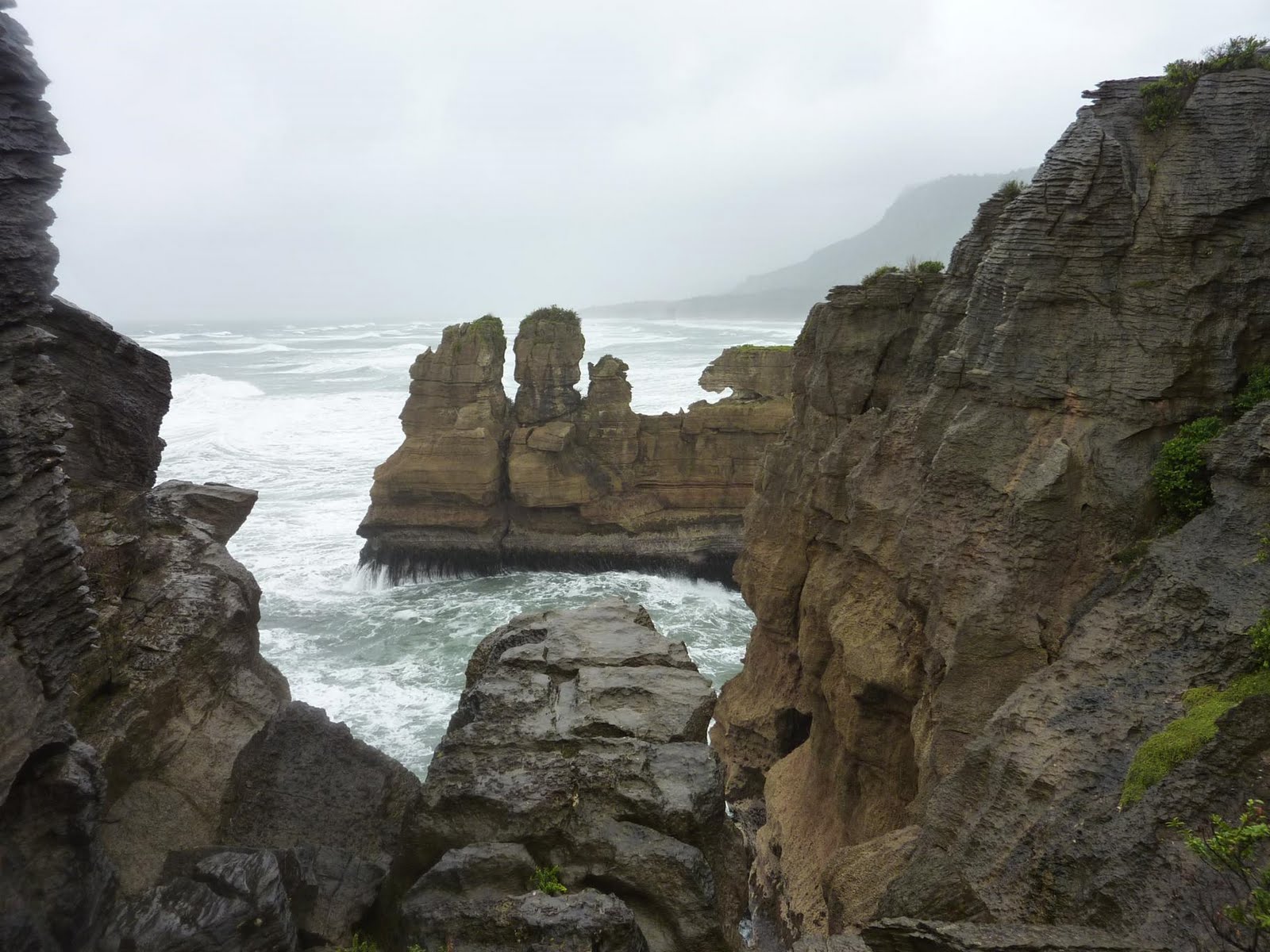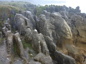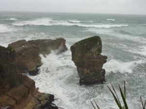 A mitad de camino entre Westport y Greymouth tenemos las Pancakes Rocks, unas formaciones rocosas con forma de tortitas apiladas que inexplicablemente solo se dan en este punto concreto del camino. Entre estas rocas aparecen unos huecos en los que el mar se filtra con fuerza provocando que chorros enormes de agua y espuma suban hacia la superficie durante la marea alta. Con marea baja el efecto no es tan grande pero sigue siendo impresionante.