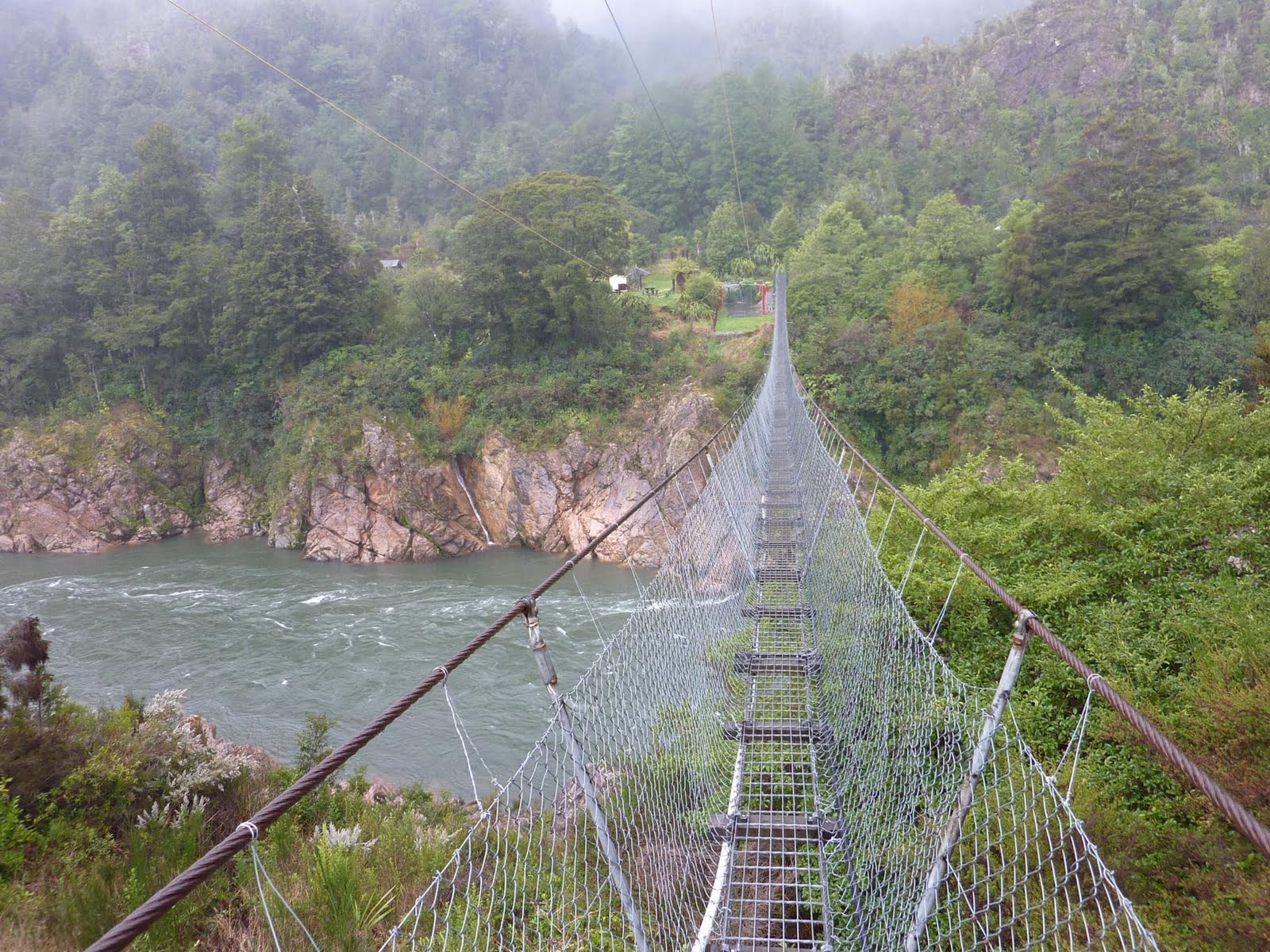 Seguimos hacia la costa, y cruzamos Victoria Forest Park, en Buller Gorge nos encontramos con un cartel que anuncia el puente colgante mas largo de NZ y me apunto a cruzarlo, esta lloviendo y según me bajo de la furgoneta se pone a diluviar. Miro para atrás y veo que me he quedado solo para esta aventura pero sigo decidido, me venden el ticket y empiezo a cruzar el puente. Se mueve una brutalidad y tengo que ir agarrado en todo momento, el suelo metálico que resbala bastante no ayuda a mantener el equilibrio. Con toda el agua que esta cayendo, el rio va hasta arriba y hace que incluso aparezcan pequeñas cataratas, la velocidad con la que pasa el agua da bastante respeto.