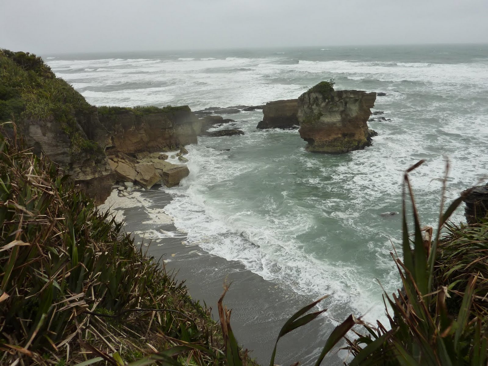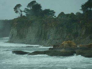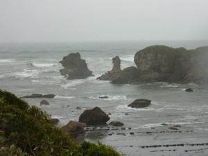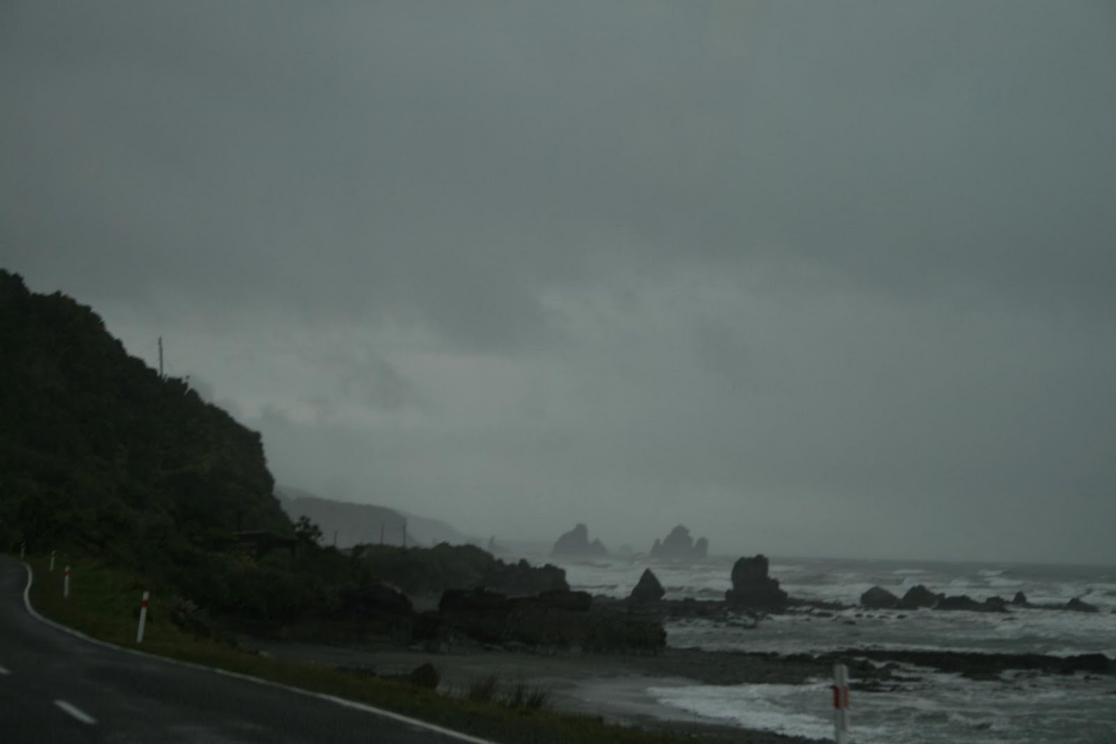 La verdad es que no defrauda, y aunque no para de llover ni un minuto, veremos como algo positivo que el gris del cielo le da un tono misterioso y dramático. La carretera va constantemente paralela al agua y en los únicos puntos que se aleja un poco es para coger altura y ofrecer un punto de vista elevado sobre el litoral. Este se compone de kilometros y kilometros de playas de piedra solo separadas por enormes salientes de piedra que el mar parece va cortando con paciencia, es como si estos salientes se fuesen despedazando y sus restos se quedaran a pocos metros de la orilla, creando un paisaje espectacular.