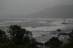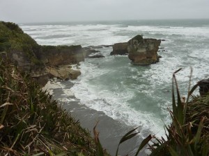 A partir de este punto parece que la costa se relaja y ya no es tan abrupta, pero hemos cambiado la fuerza del mar por la del viento que con unas ráfagas fuertes y continuas intenta sacarnos de la carretera. A la altura de Hoikitika salimos hasta la playa para sentir el viento y vemos a las gaviotas que no aguantan quietas, el aire las empuja y no pueden volar por lo que optan por buscar refugio detrás de piedras o incluso de nuestra propia furgo.