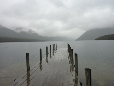 A la altura de St. Arnaud nos acercamos a Nelson Lakes National Park, concretamente al Lago Rotoiti donde desde la orilla y bajo una lluvia constante sacamos alguna foto y jugamos con los patos que se acercan a la furgoneta, no se si buscando el calor del motor o que les echemos algo de comida. El lago es bastante grande aunque con la niebla que cubre la orilla solo podemos imaginárnoslo, de repente aparece un autobús de un tour, se bajan un grupo de personas y alguno de ellos se pone en calzoncillos y salta al agua desde el embarcadero. A los dos segundos salen tiritando, y espero que hayan ganado alguna apuesta porque si no es para matarlos, el agua esta helada y el día no ayuda.