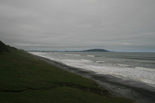 Cuando alcanzamos la costa el paisaje vuelve a ser una combinación del negro de la orilla con el gris oscuro del mar al que ya nos estamos acostumbrando. Las olas golpean la costa con fuerza para recordarnos que estamos en invierno y aunque la zona es extremadamente popular entre los surfers del pais, ahora no apetece demasiado meterse en el agua.