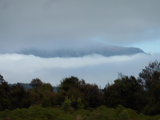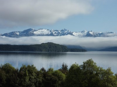 Salimos de Te Anau con dirección sur, las nubes cubren el cielo aunque en algún punto se ve un poco de azul. Mirando atentamente vemos que entre lo azul aparece un pico nevado y luego según vamos avanzando una cadena de montañas nevadas van apareciendo.