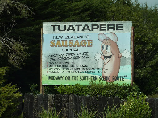 otros mediante murales en la calle principal del pueblo o como Tuatapere, reclamando para si mismo el titulo de capital de la salchicha de Nueva Zelanda !!