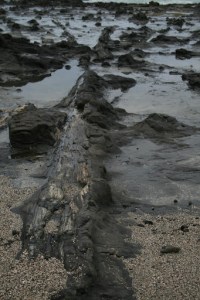 Con la luz del día y sin señal de vida de los leones marinos salimos del camping, después de pagar !! y nos acercamos a Curio Bay donde en marea baja puedes ver un bosque petrificado de la época jurásica, y no, no hay ningún dinosaurio a la vista. Es curioso como la madera de los arboles fosilizados se diferencia perfectamente de la roca permitiendo ver incluso los nudos de la madera. Entre los curiosos vemos una pareja con la que coincidiremos varias veces en los próximos días y un pingüino de ojos amarillos muy juguetón que se dedica a nadar a lo lejos en una piscina de agua que han formado en la roca las enormes olas que vemos,