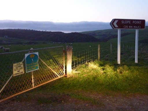 Primero tengo que decir que llegamos casi al anochecer, ya que ademas de ir tarde, un enorme rebaño de ovejas nos retuvo en la carretera por un buen rato. En cuanto empezamos a recorrer la carretera vimos que aquello no iba a ser un paseo, a los pocos kilometros dejaba de estar asfaltada y pasaba a ser una dura sucesión de curvas y toboganes en los que la furgo bajaba en picado y luego casi no era capaz de subir, ademas tras llegar a Slope Point, que es en realidad el punto mas al sur de NZ, nos quedamos con las ganas ya que el ultimo trozo que es un corto paseo no lo pudimos hacer por estar cerrado por Lambing.