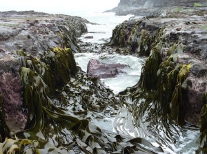 en el mismo punto se puede ver un pequeño cañón formado en la roca donde el mar aprovecha para dejar todo tipo de algas en cada golpe. Salimos pitando para llegar a tiempo a Cathedral Cove una enorme cueva formada en el mar y que solo se puede visitar en marea baja. Cuando llegamos un cartel nos indica que esta cerrado el acceso, esta vez no por lambing sino por las mareas vivas.