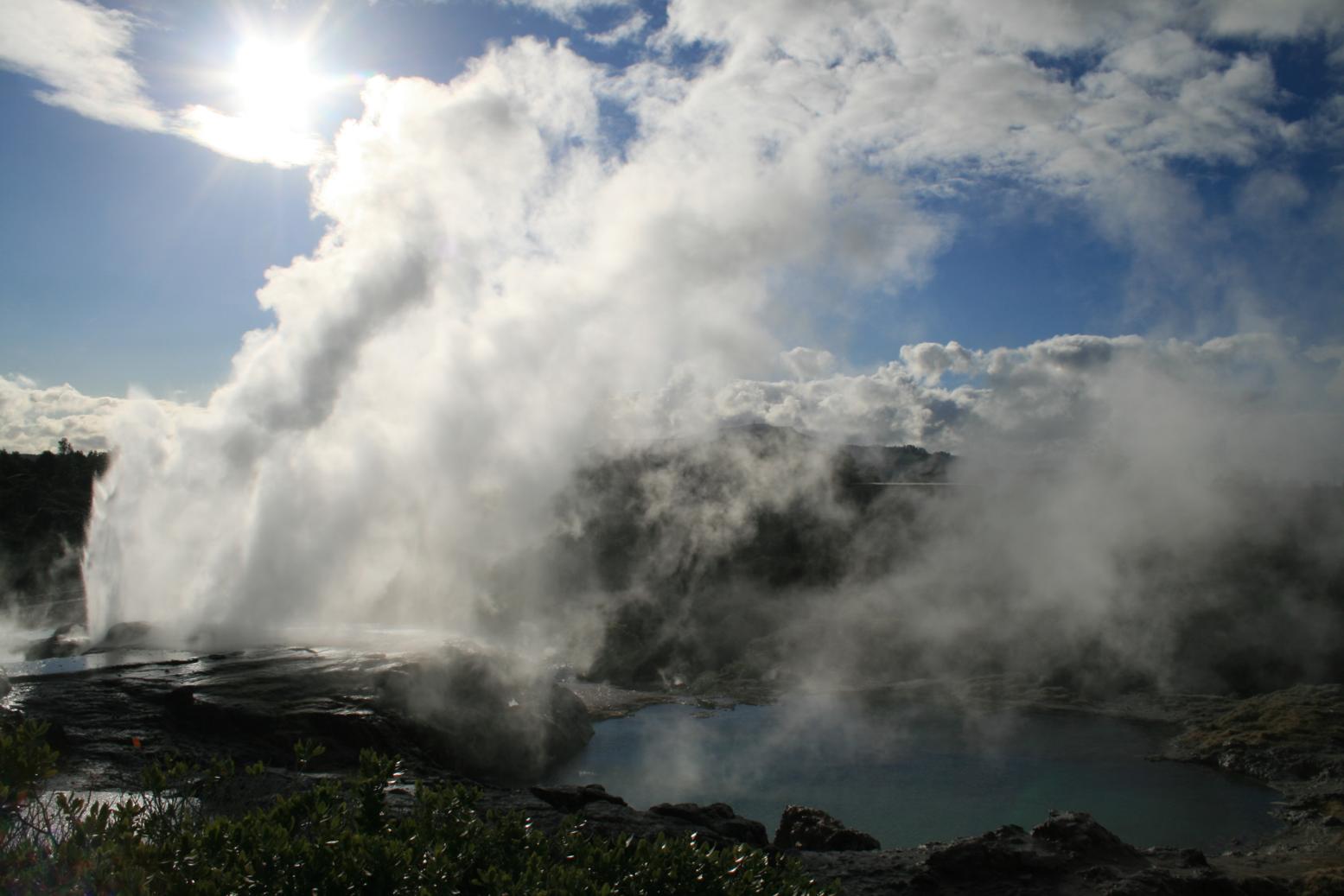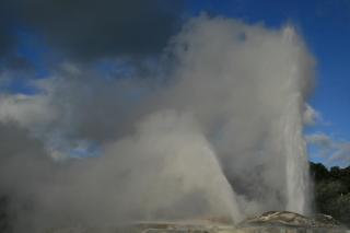 Decidimos hacer una que combina las dos y visitamos Te Puia, un parque en el que se visita un Geyser gigante que explota cada pocos minutos, un montón de pozas en las que el barro esta en constante ebullición y otra zona con fumarolas en las que el humo con olor a sulfuro sale a través de las grietas. Dejando aparte todos estos fenómenos volcánicos también hay una exposición de cultura Maorí, una casa en la que puedes ver Kiwis en cautividad (que mal suena), y una zona en la que una Marae ocupa el lugar principal entre varias edificaciones típicamente Maoríes, también asistimos a una representación de danza, canto y lucha, no es nada del otro mundo pero como muestra vale.