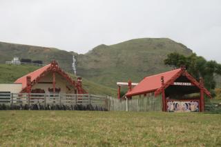También vemos una Marae, edificio religioso y de reunión Maorí en la falda de una montaña con unas vistas espectaculares y una catarata al fondo aunque hay que reconocer que la decoración del templo tampoco desmerece.