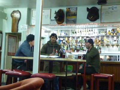 Entro y la recepción es el bar, donde los cazadores descalzos ya que las botas llenas de barro estaban en la entrada beben una cerveza detrás de otra. Cogemos habitación y bueno es curiosa, el aire entra por las grietas de las ventanas, las lamparas no tienen bombillas y hay un enchufe en toda la habitación donde conectar la estufa, las lamparas si estuvieran completas o cualquier cosa que necesites a través de una zapatilla que tiene pinta de empezar a arder en cualquier momento, como no hay mas sitios y no andamos sobrados de gasolina nos quedamos. Salimos a cenar y los cazadores siguen engullendo cervezas y de cada tres palabras dos son fuck, nos miran hacen bromas, me acuerdo del jabalí y miro silbando para otro lado, igual son simpatiquisimos pero la combinación armas y cerveza no me convence nada.