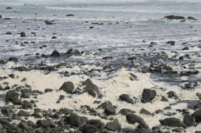 Aunque estamos a los pies del Monte Taranaki que en todas las guías aparece majestuoso con sus 2518 metros no vemos nada de nada, vamos hacia la costa sin que pare de llover ni un minuto, y aunque la orilla del mar esta espectacularmente bonita con una gama infinita de grises, entre las piedras, el mar y el cielo no podemos disfrutar porque cuando para la lluvia por un minuto todavía queda el viento que no nos deja casi estar de pie y la espuma del mar sale volando como si fueran copos de nieve amarillentos y se meten tierra adentro.
