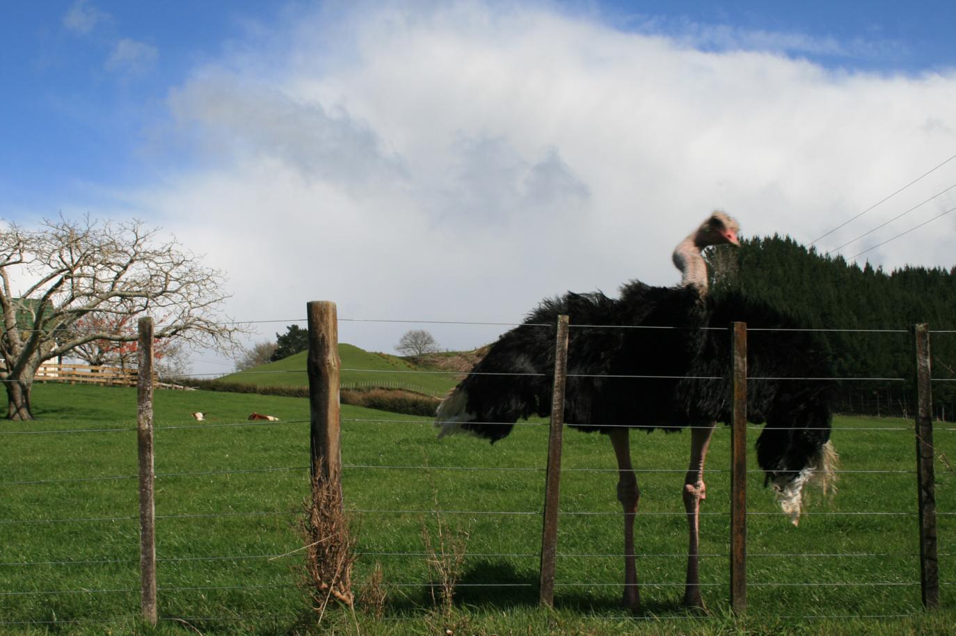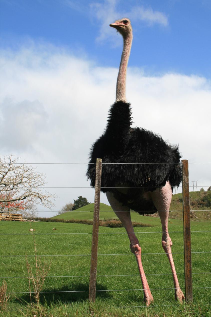 Poco antes de incorporarnos a la carretera principal vemos a un par de avestruces gigantescas y cuando salgo a sacarles una foto, una de ellas corre a acercarse a mi, se planta enfrente ahueca las alas y se pone a bailar, no se si para intimidarme o para cortejarme, pero no podemos parar de reír alucinados, corro para un lado y me sigue, para el otro también, cuando al final me alejo se queda con pena, igual si es que me estaba cortejando, pero lo siento, no es mi tipo, demasiado alta.