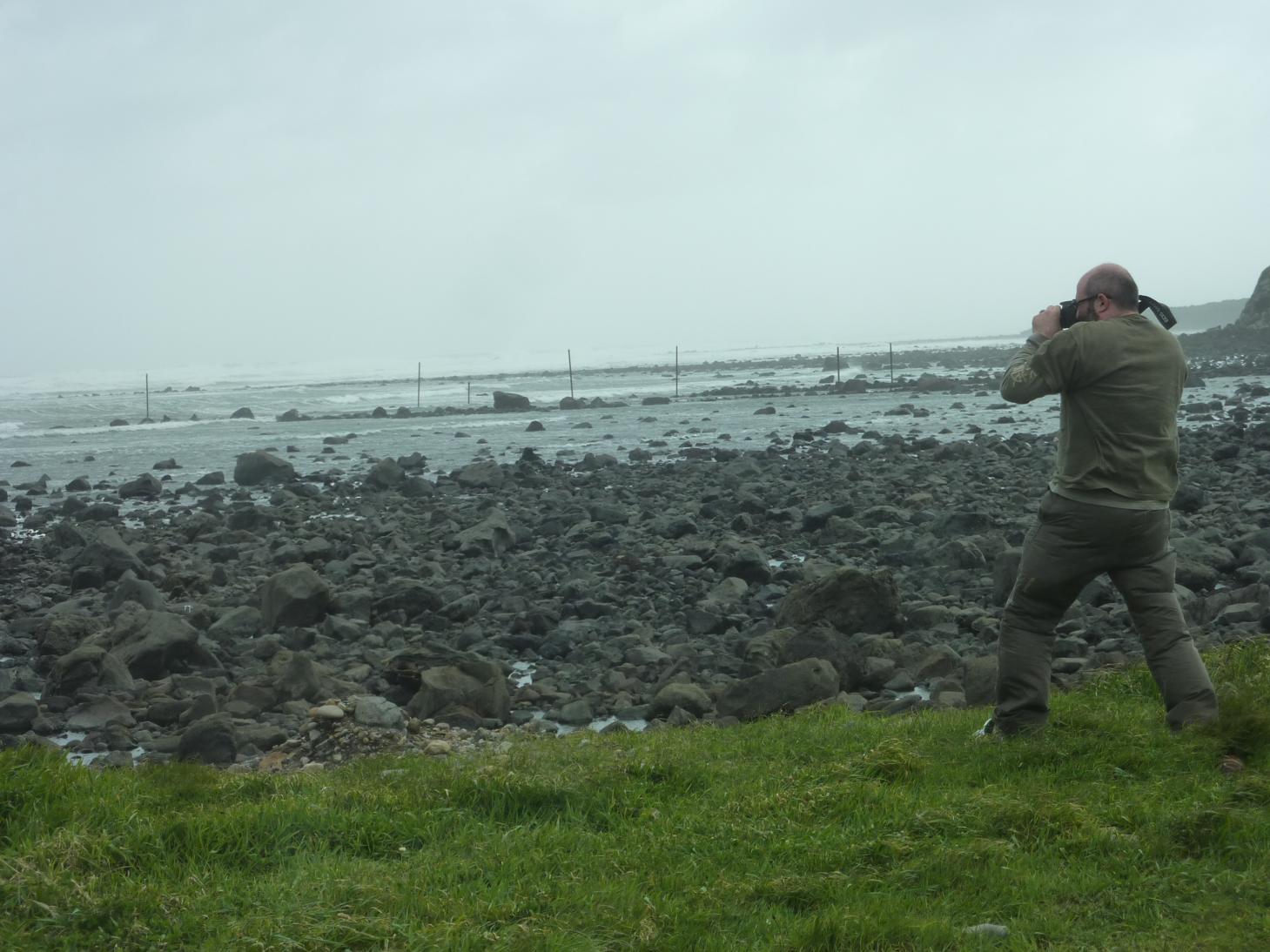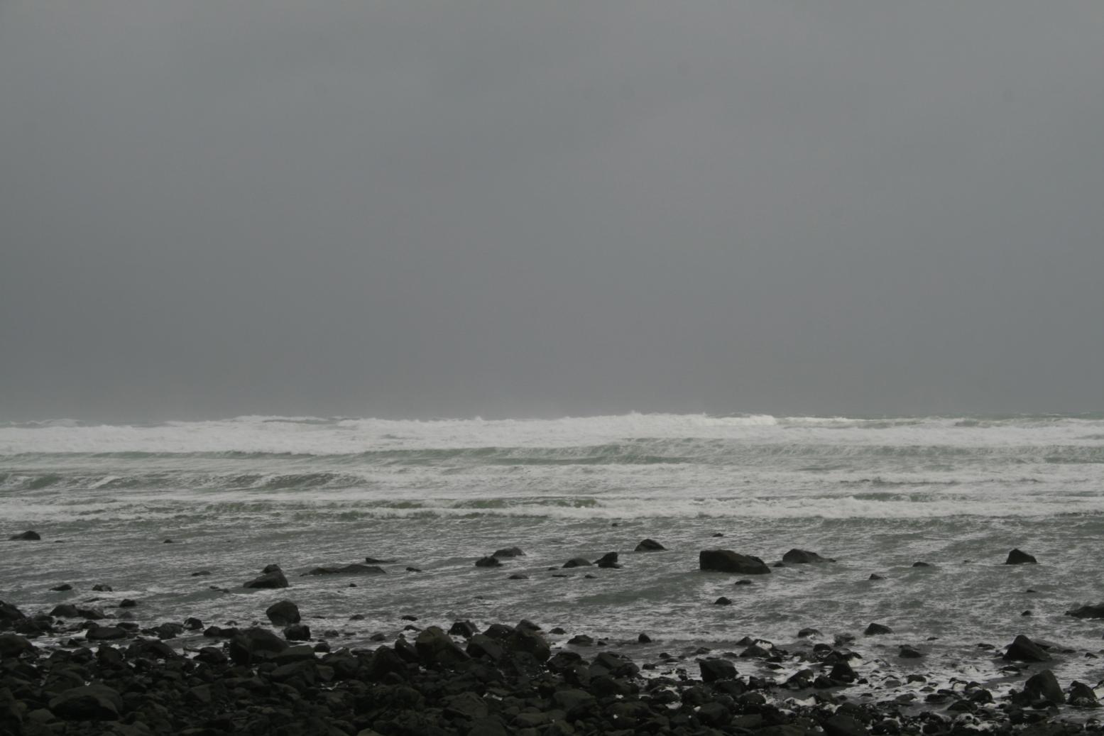 Aunque estamos a los pies del Monte Taranaki que en todas las guías aparece majestuoso con sus 2518 metros no vemos nada de nada, vamos hacia la costa sin que pare de llover ni un minuto, y aunque la orilla del mar esta espectacularmente bonita con una gama infinita de grises, entre las piedras, el mar y el cielo no podemos disfrutar porque cuando para la lluvia por un minuto todavía queda el viento que no nos deja casi estar de pie y la espuma del mar sale volando como si fueran copos de nieve amarillentos y se meten tierra adentro.