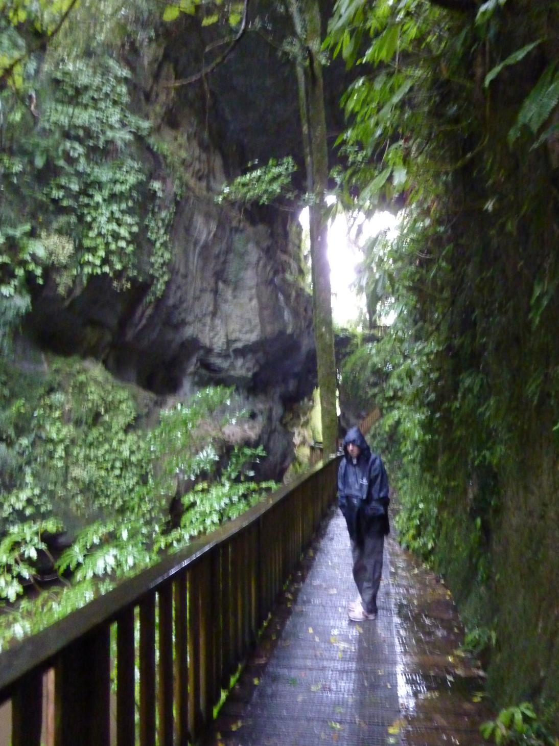 Paramos rápidamente en Mangapohue natural Bridge y damos un paseo entre mas lluvia por una grieta entre montañas cruzada por un rió, pero en un único punto se ha formado una estrecha cueva que forma un puente y permite pasar el rió de manera natural, bonito sin mas.