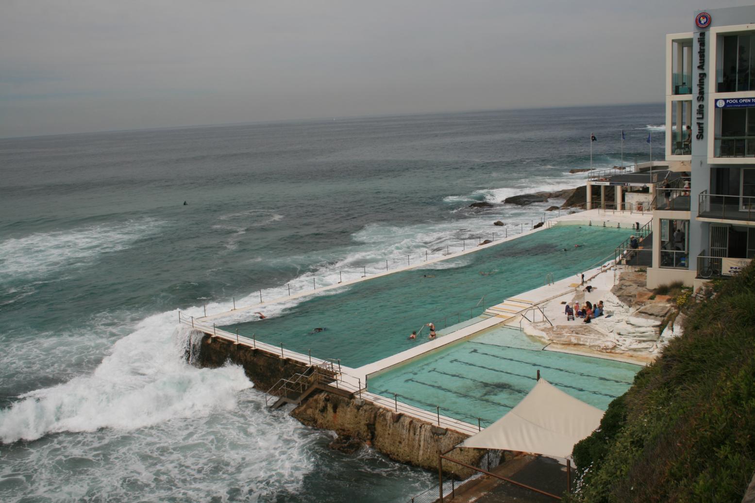 La fama de Bondi Beach viene dada por sus salvavidas, una especie de Vigilantes de la Playa californianos con menos pelo en el pecho. Su lugar de entrenamiento es impresionante, una privilegiada piscina tan a borde del mar que cuando saltan las olas la cubren casi por completo. Vemos como uno de ellos después de un buen rato calentando haciendo largos, salta al mar para cruzar la bahía a nado sin demasiado esfuerzo, a mitad de camino se cruza con un compañero que de pie sobre una tabla de surf vigila que ninguno de los cientos de surfers que intentan coger olas se ahogue.
