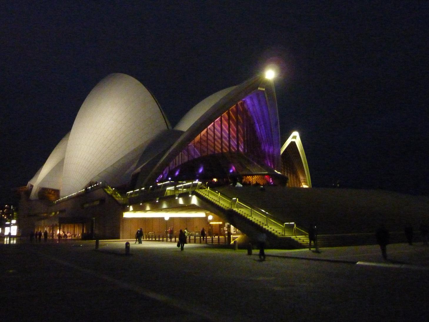 El sábado a la noche nos damos una vuelta por la ciudad repitiendo algunas de las visitas para ver los edificios iluminados, pero lo que de verdad nos ilumina es el desfile de gente preparada para salir por la noche. y lo que entre semana había sido una anécdota, ahora ya es de escándalo, la gente en Sydney se arregla mucho, y lo de enseñar cacha es una prioridad. No importa demasiado si estas para enseñarla o no, la cuestión es que la gente se fije. Eso si, es curioso ver a señoritas de punta en blanco y con una bolsa de papel en la mano constantemente, primero pensamos que es algo que han comprado, pero todas? Al final descubrimos que en la bolsa lo que llevan es un botellín de agua, un pañuelo para cuando refresque y no haya necesidad de enseñar pechuga y unos zapatos para cuando los pies se quejen de los enormes y espectaculares tacones que llevan. Eso si, lo siento chicos pero de esto no hay fotos.