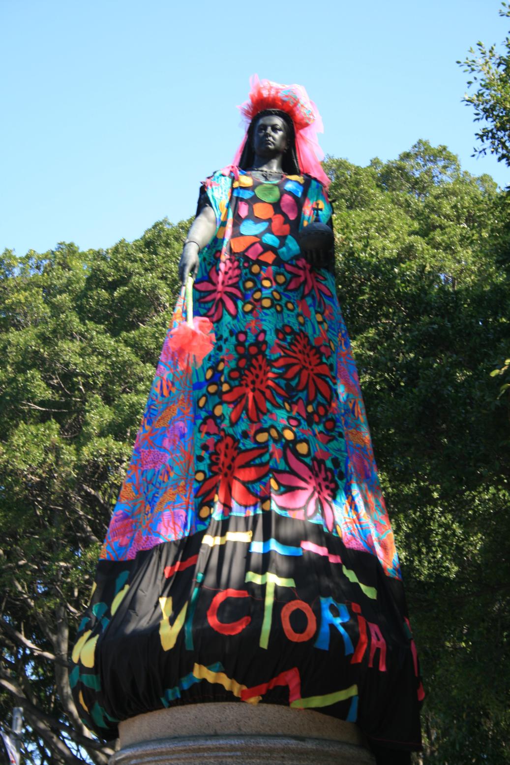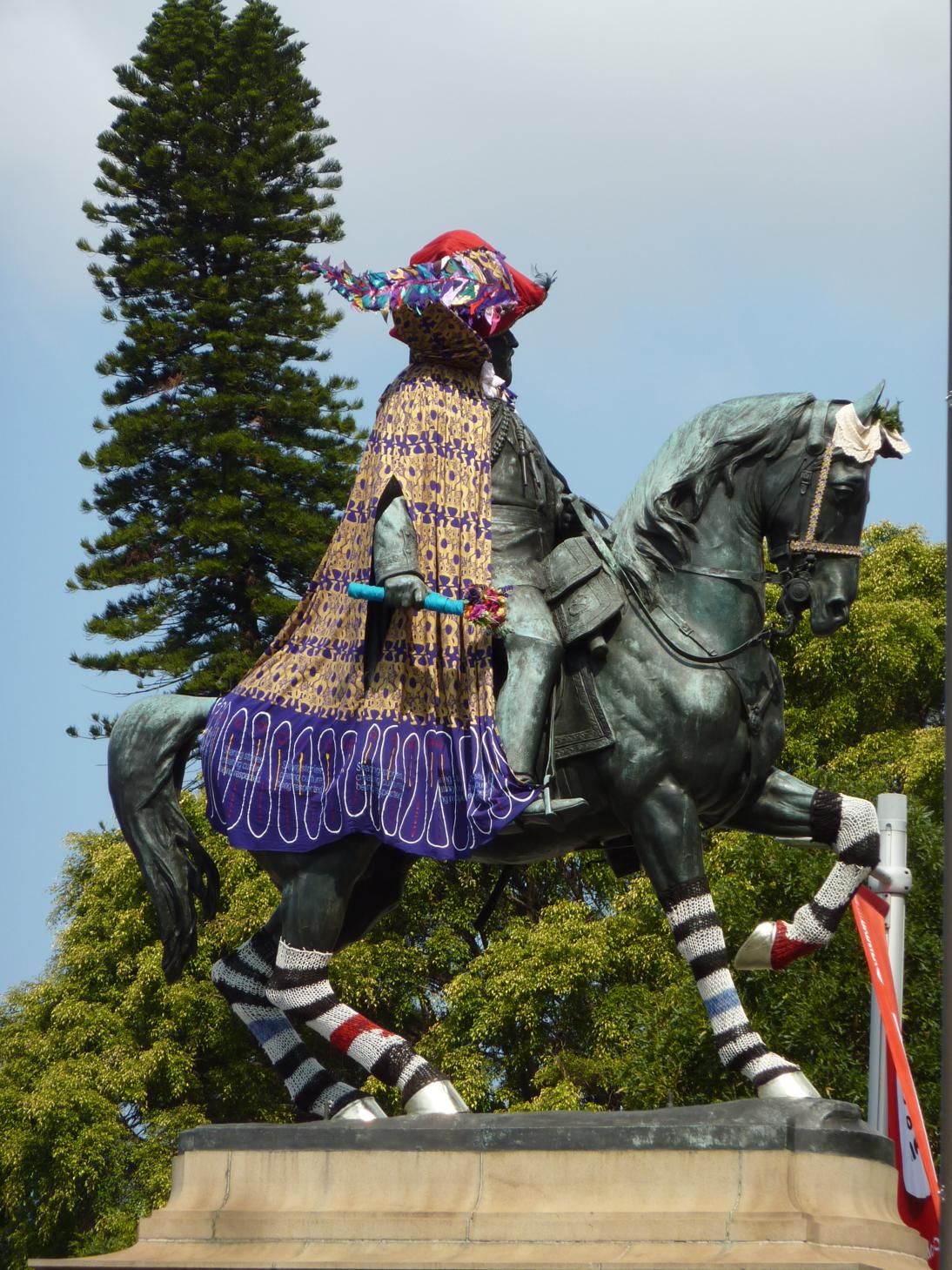 También aprovechamos para ir buscando entre las diferentes estatuas que hay por la ciudad cuales han elegido en la muestra de arte para vestir con ropas modernas y estrambóticas.