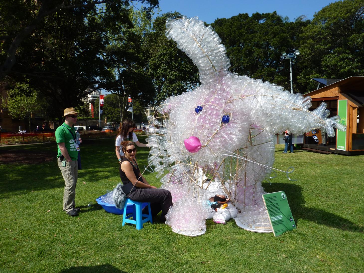 La muestra se llama Art & About y combina arte con conciencia ecológica mediante obras que en algunos casos reflejan la situación del medio-ambiente como un conejo hecho a base de botellas de agua recuperadas.