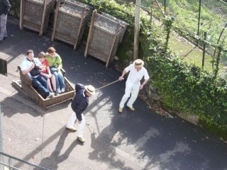 Un montón de hombres con sombreros de paja montan a los visitantes en unos carros con patines y los deslizan montaña abajo, aunque tenia ganas de probarlo, tras un vistazo desaparece la magia, no van demasiado rápido y todo es demasiado turístico, foto incluida, así que optamos por el teleferico que aunque mas lento parece mas atractivo.