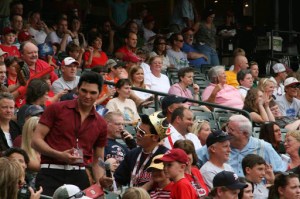 Tengo que reconocer que aunque fue un partido largo, el tiempo se nos paso volando. Comimos perritos calientes, curioseamos a la gente que se dedicaba a anotar cada jugada para las estadísticas en libretas, vimos bailar a las animadoras, intentamos coger regalos de los que lanzaban al publico con cañones y sacamos decenas de fotos del publico, de los jugadores y de los imitadores de Elvis que se pasaban por las gradas saludando a la gente.