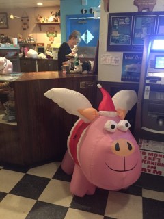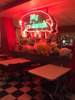 Lamentablemente aquel día no había nada de nada ya que estaba cerrado por descanso semanal. Habíamos ido hasta allí para nada, dimos la vuelta y a unos doscientos metros vimos un restaurante con pinta de Diner y nos acercamos. El sitio se llamaba Mary Ann´s Pig Stand y tras ver el cerdo de neon que brillaba en la cristalera no dudamos ni un segundo y entramos de cabeza.